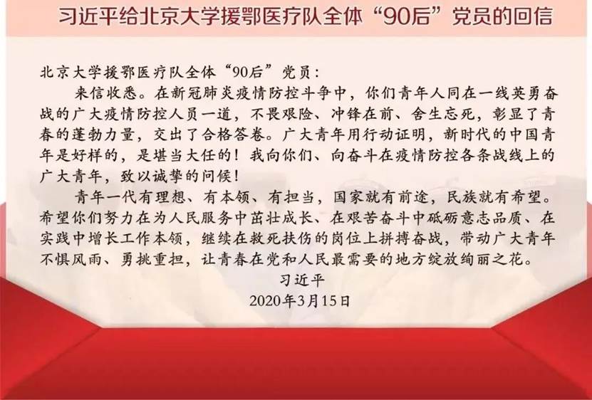 3月15日,中共中央总书记、国家主席、中央军委主席习近平给北京大学援鄂医疗队全体“90”后党员回信,在信中充分肯定了奋斗在疫情防控各条战线上的广大青年的努力,勉励青年一代不惧风雨、勇挑重担、让青春在党和人民最需要的地方绽放绚丽之花。pg电子试玩