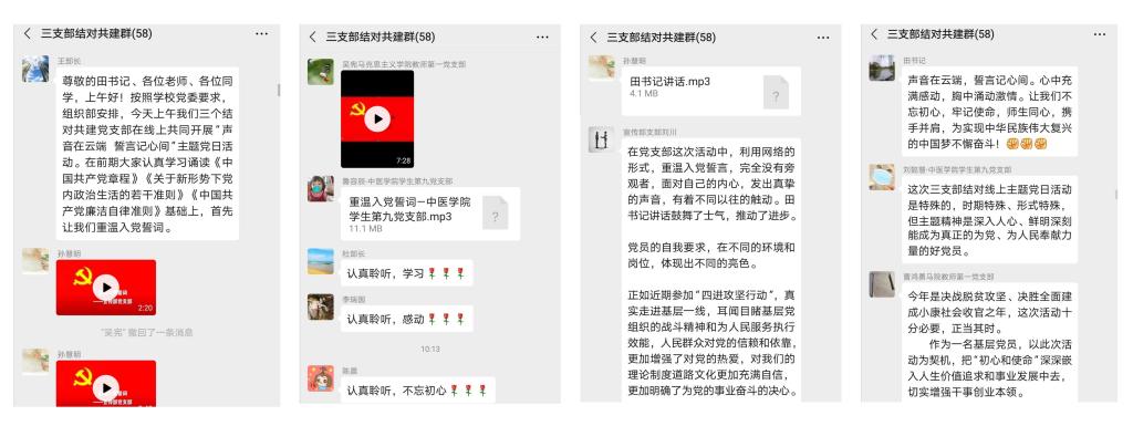 学生第九支部联合开展的“声音在云端,誓言记心间”主题党日活动,与支部党员一起深入学习《中国共产党章程》《关于新形势下党内政治生活的若干准则》《中国共产党廉洁自律准则》等党纪党规内容,并重温了入党誓词。本次活动在线上进行。