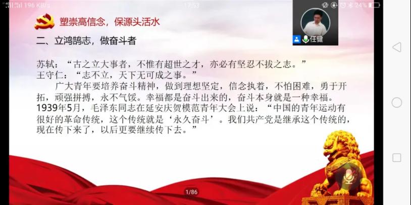9月28日第二节党课,任健老师以党的思想为经,党的历史为纬,生动透彻地讲述了党的正确、先进的思想理论及其重要意义。老师通过伟人故事及党的发展中的重要事件,指出党的先进思想指引我们向前,让我们的国家、民族一步步走上伟大复兴的中国路。同时老师强调作为入党积极分子的同学们在党的思想的领导下不仅要坚定理想信念,忠于国家人民,还要立鸿鹄志做奋斗者,真正做到知行合一,为祖国和自己热爱的中医事业鞠躬尽力。