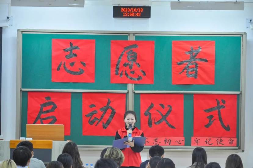 办公室各位辅导员老师,并进行了精彩的致词。在讲话中朱默里老师对志愿者们的表现寄予厚望。她强调,生活在社会中的我们应当回报社会,青年学生应当在给予和奉献中实现自我的价值,收获人生的力量。作为新时代的年轻人,我们中医学子将永怀一颗济世之心,将远大的理想抱负和实际相结合,仰望星空,脚踏实地,坚持为人民谋幸福、为中华民族伟大复兴奋勇前进。随后志愿者代表张筱钰发言,从身边的故事和自身志愿者经验向大家发出呼吁:要用爱心耐心责任心,担负起时代的重任,在人生道路上走的更正更远,并带领志愿者们宣誓。气势磅礴、声音洪亮的誓词,展现着志愿者们服务社会的决心。