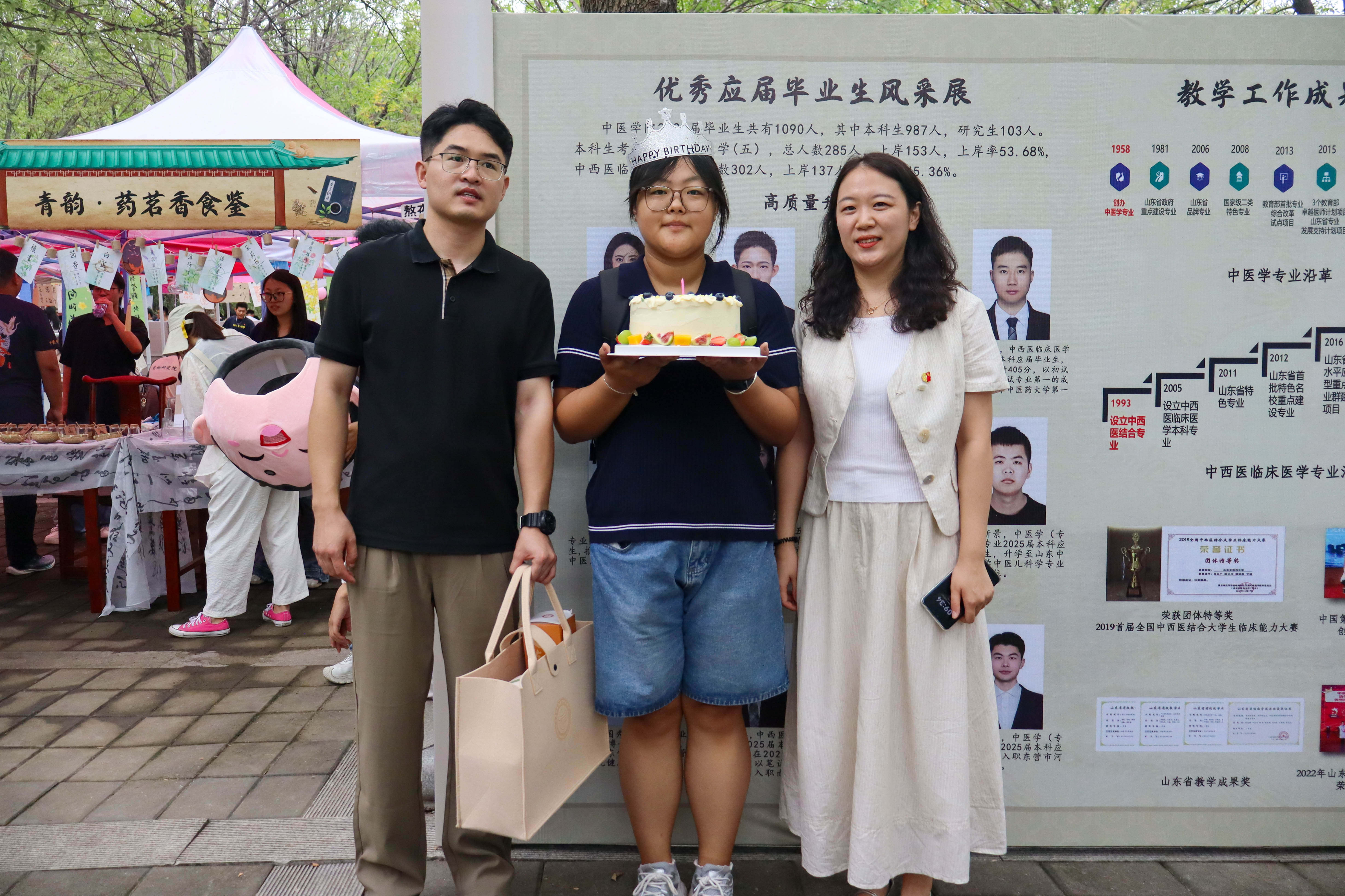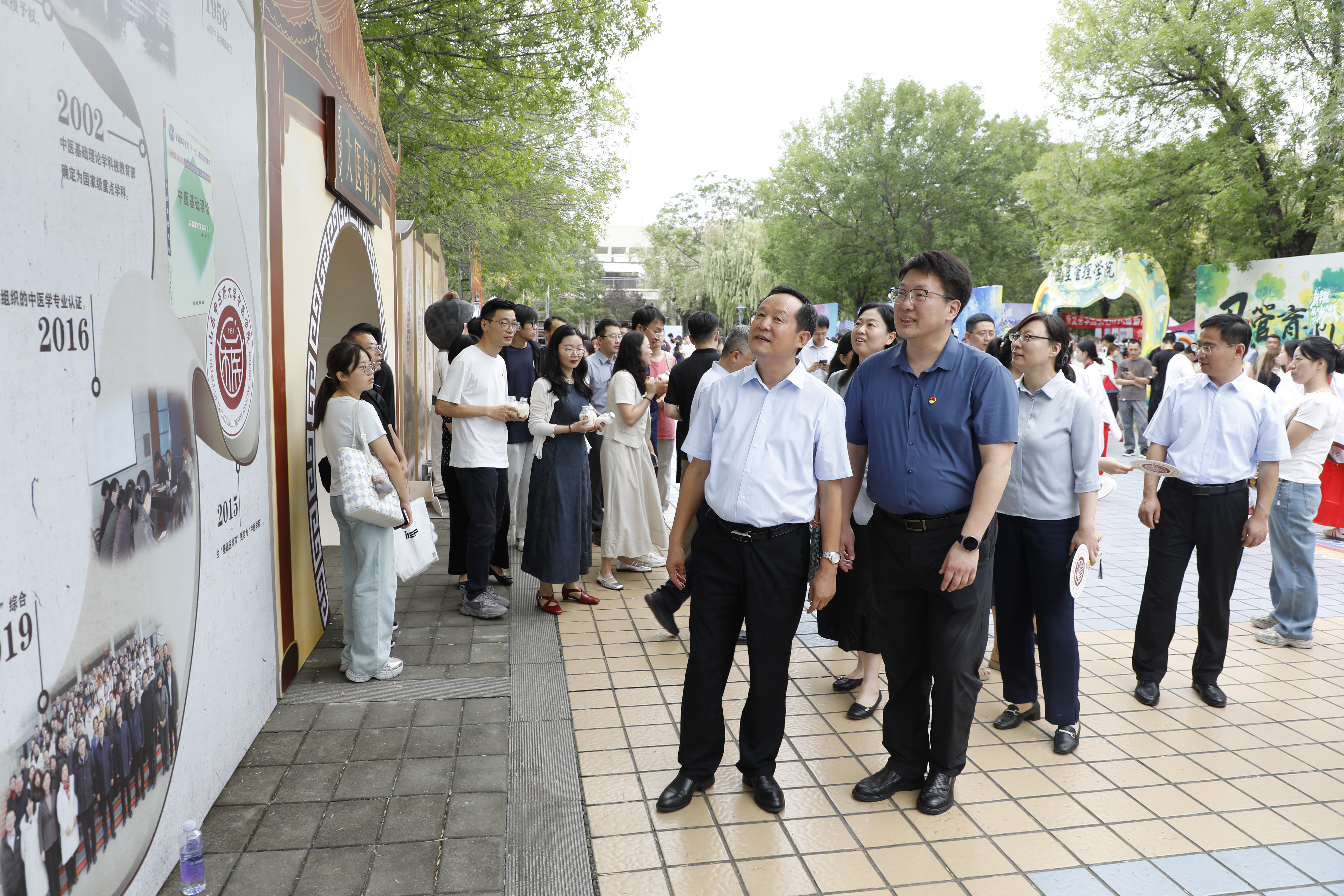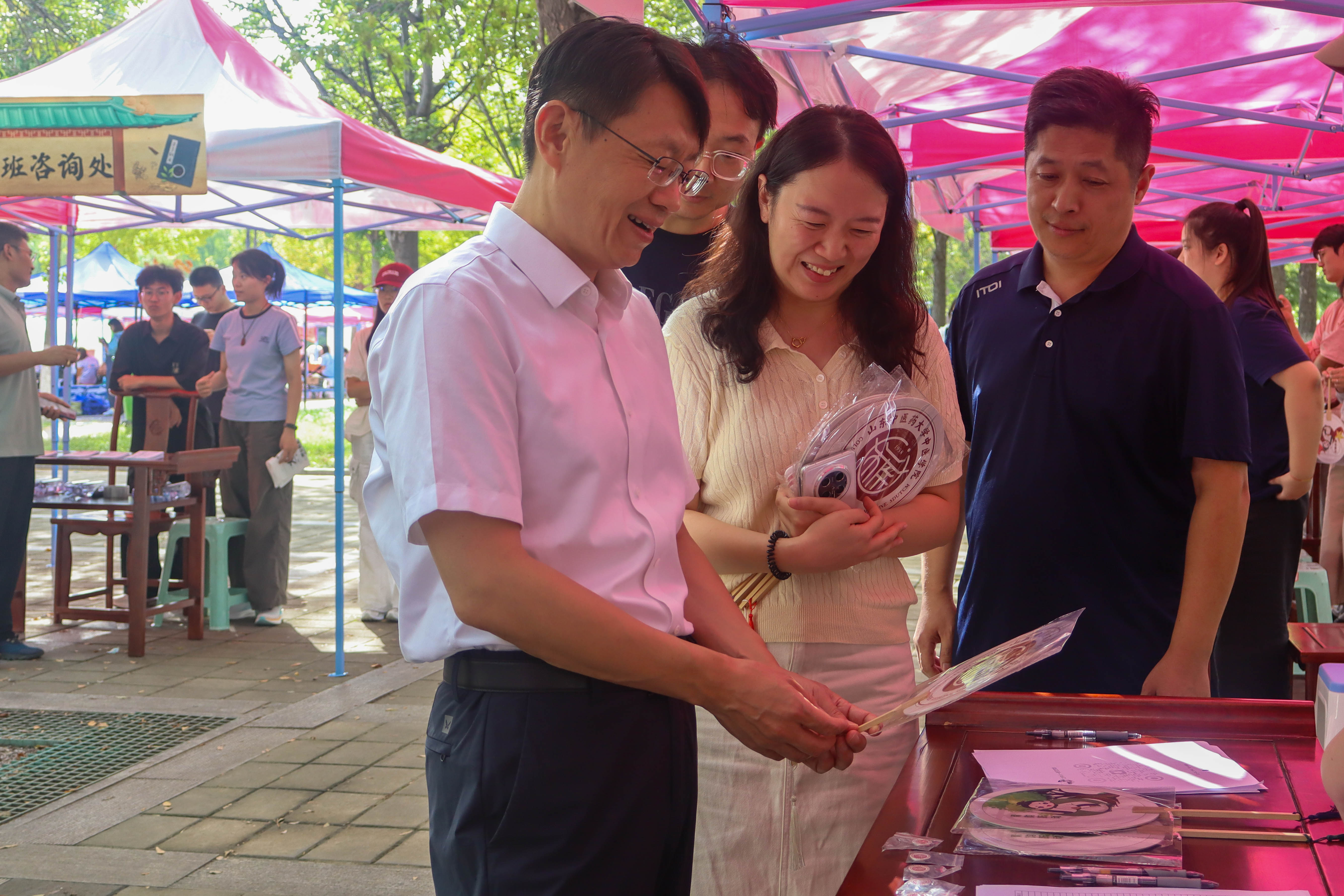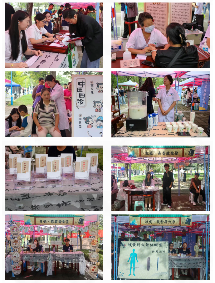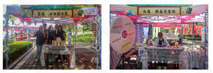 以“五色润心,‘游’中助学”为主题,创新打造“五行五色”中医药文化游园会,将迎新报到与文化传播有机融合。“红医”板块设立新中鲁义诊及学生推拿体验区,帮助新生直观感受中医诊疗的魅力;“青韵”板块聚焦中医生活化理念,通过中药奶茶、药食同源产品体验和《中医药文化与生活丛书》展示,生动传播中药知识;“岐黄”板块借助针灸器具展览和互动游戏,引导新生了解经络穴位与针灸文化;“墨香”板块集中陈列中医经典典籍,彰显中医药深厚的历史底蕴;“白盾”板块则围绕防诈骗、消防安全等主题,以科普宣传和趣味游戏增强新生的安全防护意识。各展区巧妙融合药香与墨香,通过沉浸式、互动化的方式,立体呈现中医药文化的丰富内涵。
