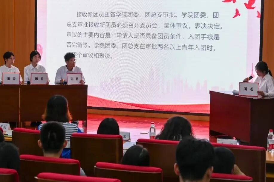 活动现场,主持人系统讲解了从入团申请、发展对象的确立到入团仪式等全过程的规范要求,同时对入团积极分子谈话、支部大会讨论表决、入团仪式等标志性场景进行现场演示,将严谨的规章制度转化为直观的情景再现,既彰显了团员发展工作的严肃性与规范性,也通过沉浸式体验深化了团员们对流程的理解。