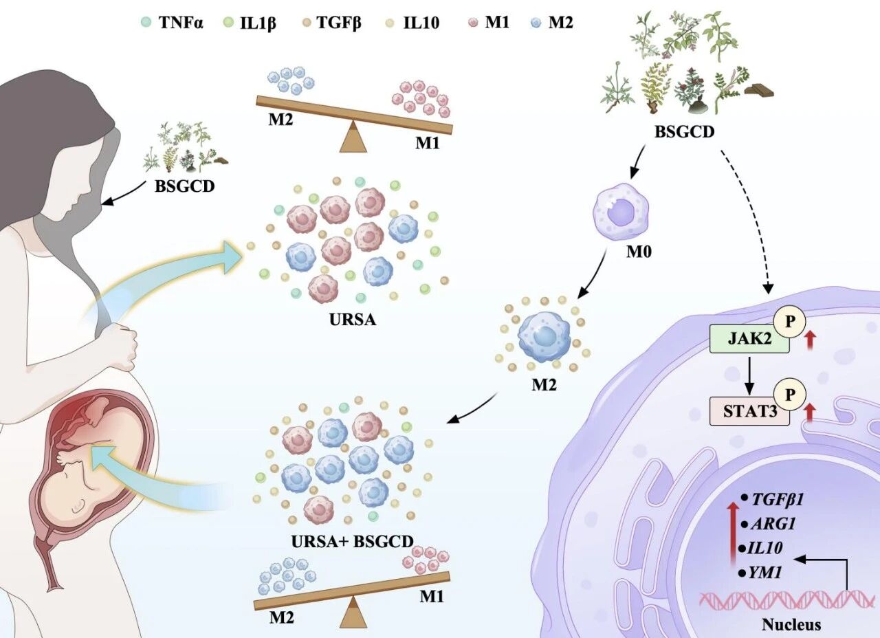 近日,我校中医学部李霞教授团队在中医药免疫调控研究领域再创佳绩,在国际医学领域杂志Phytomedicine(中科院1区Top,IF:8.3)发表题为“Bushen Guchong decoction facilitates M2 polarization through JAK2/STAT3 for URSA treatment”的研究论文。该研究系统揭示了临床有效方剂补肾固冲汤(BSGCD)通过重塑母胎界面免疫耐受治疗原因不明复发性自然流产(URSA)的作用机制。中医学部刘泳琳硕士、青年教师刘鑫馗及朱肖肖博士为共同第一作者,李霞教授、张振副教授为共同通讯作者,山东中医药大学为第一作者和通讯单位。
