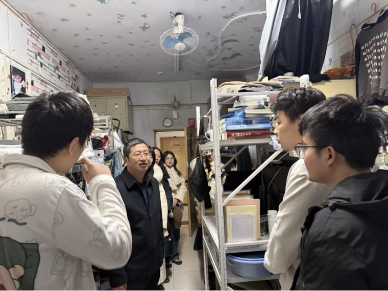 领导与辅导员走访学生宿舍,与同学们亲切交流,了解同学们的学习生活情况,并仔细查看宿舍卫生状况、用电规范、消防设施配备等情况,重点排查违规使用大功率电器、私拉乱接电线等安全隐患。