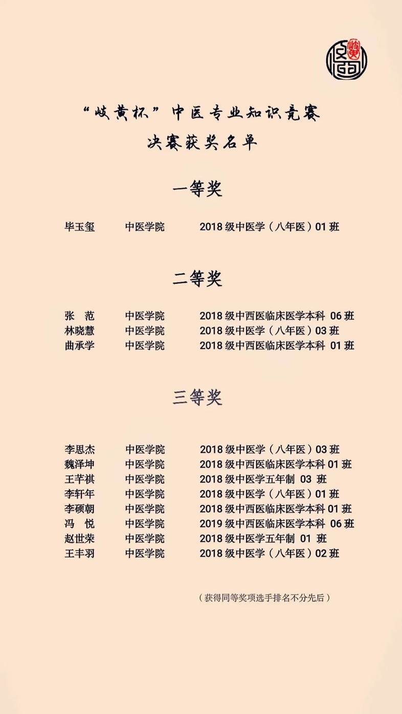 本次比赛共有664名同学参加海选,216名同学参加初赛,30名选手晋级复赛,最终12位选手脱颖而出进入决赛。决赛中选手们经过实践技能比赛、小组赛、晋级赛、擂台赛四个环节地激烈角逐,最终2018级中医学(八年医)专业毕玉玺获得一等奖,3名同学获得二等奖,8名同学获得三等奖。