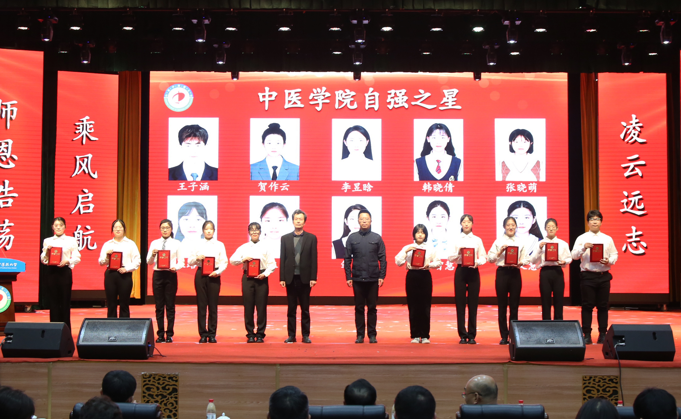 文艺汇演在舞蹈《美丽中国》中拉开帷幕,器乐合奏《灯火里的中国》抒发了对祖国的无限深情和美好祝福;朗诵《穿越时空的对话》讴歌了五千年中医文化的无穷魅力;歌曲《理想照耀青春》《燃烧》《神奇中医》以青春之名唱响信仰的力量;情景剧《小王的临导制日记》再现了学生与临床导师共论病例、共研方案、共面挑战的温情瞬间;模特走秀《绽放》等精彩的节目为观众呈现了丰盛的视听盛宴;舞蹈《雨涧春行图》《京韵》用灵动的舞姿展现了中医学子朝气蓬勃、青春激昂的精神风貌;演出在师生合唱《强国一代有我在》中完美谢幕。本次汇演节目涵盖了器乐合奏、歌曲、舞蹈、朗诵、情景剧等等多种节目类型,节目形式丰富、内容充实,反响热烈。