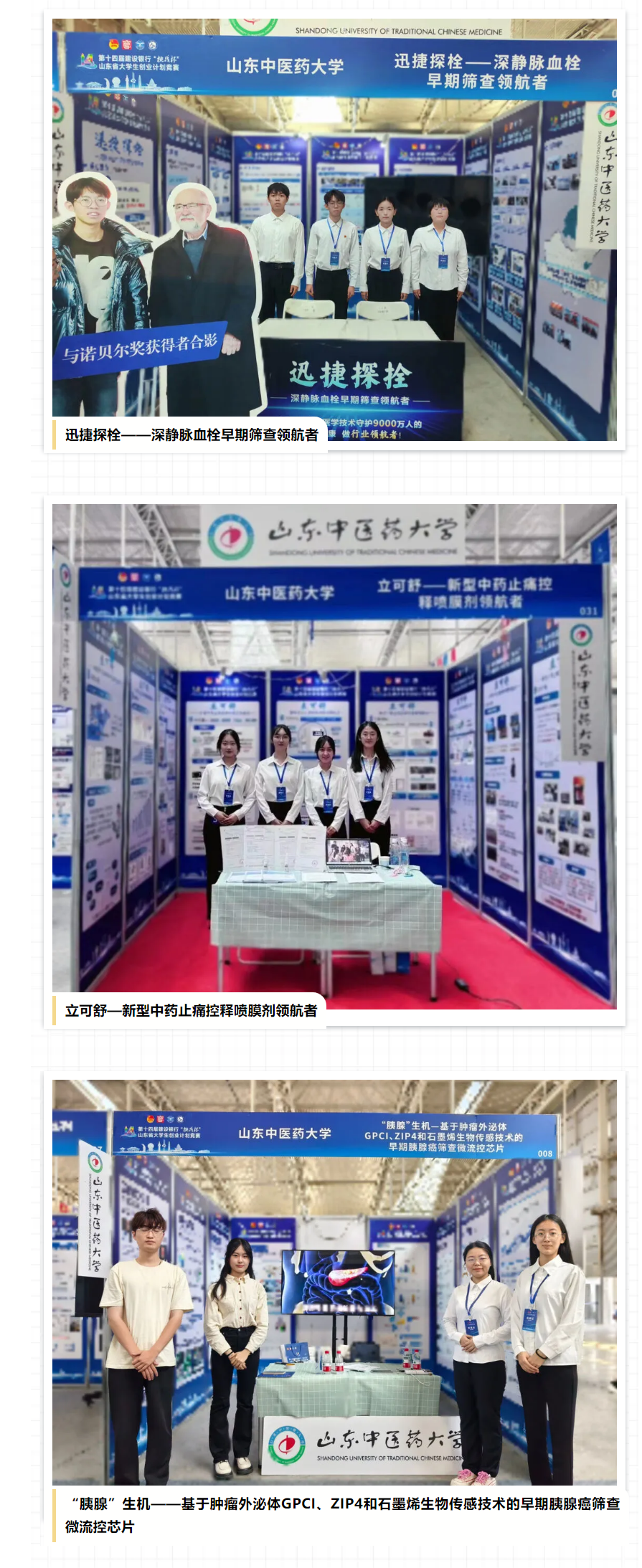 “迅捷探栓——深静脉血栓早期筛查领航者”取得金奖,“立可舒——新型中药止痛控释喷膜剂领航”、“'胰腺'生机——基于肿瘤外泌体GPCI、ZIP4和石墨烯生物传感技术的早期胰腺癌筛查微流控芯片”取得银奖。