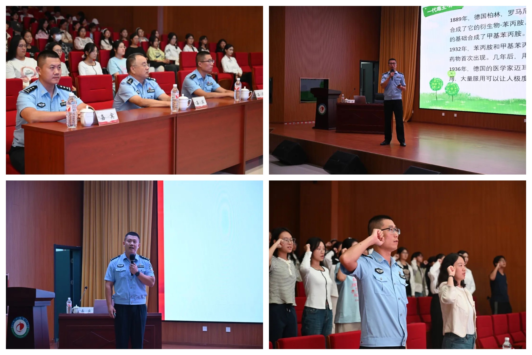 活动中,同学们积极参与互动提问,并近距离地观摩了各类仿真毒品。最后,在栾佳伟的带领下,全体人员肃立,进行了庄严的禁毒宣誓仪式。