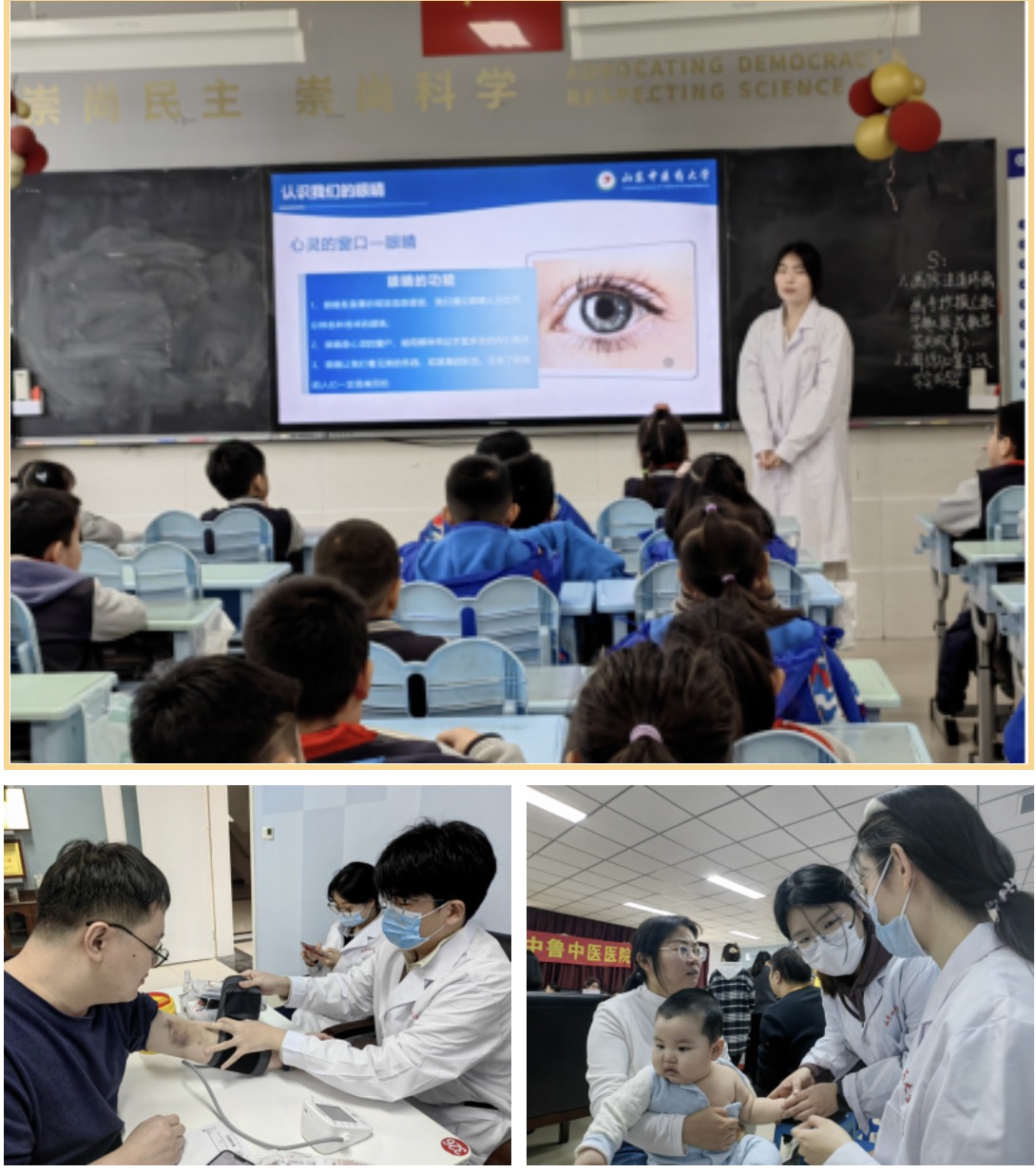 的学生志愿者发挥专业特长,开展了一系列诊疗服务项目。在推拿区,志愿者运用揉、按、点、拔等手法,为老师们缓解肩颈劳损,疏通经络运行;在测血压血糖处,志愿者们认真为老师们进行健康初检,预防疾病发生发展;志愿者们还给博园小学的学生进行了保护视力及用眼卫生的健康宣讲,为小学生们筑牢视力健康防线。