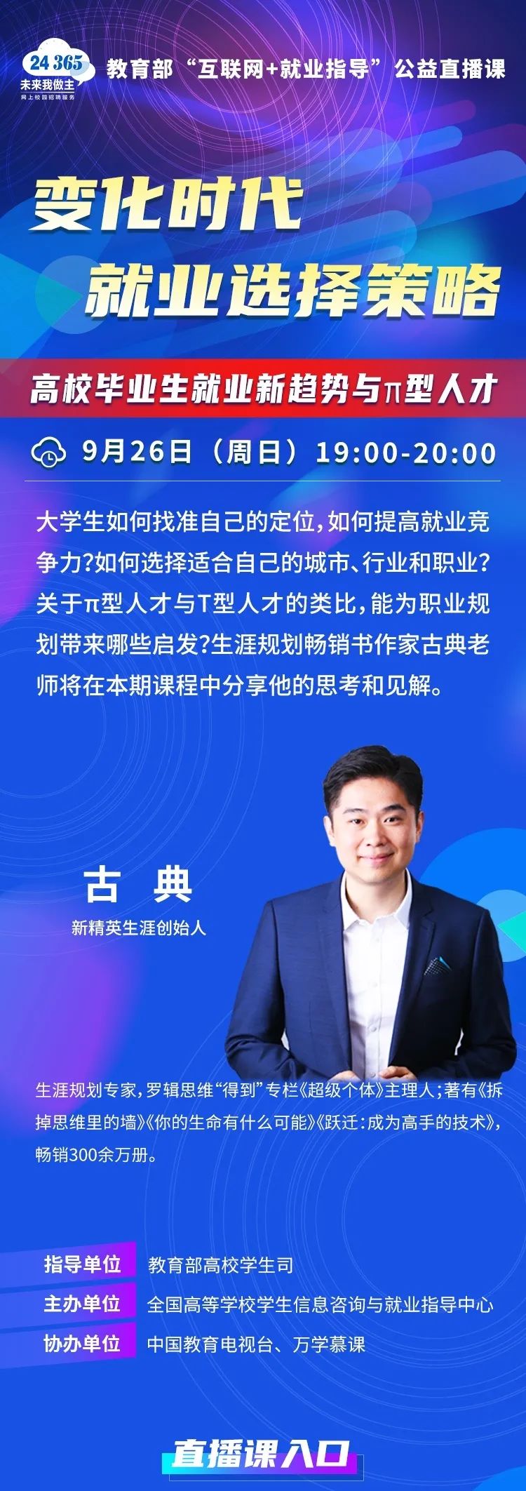 课程预告 | 教育部24365就业公益直播课:变化的时代 就业选择策略——高校毕业生就业新趋势与π型人才
