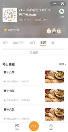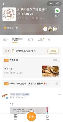 一日之计在于晨,一年之计在于春。“冬夏杯”中药打卡活动以抄写、记忆中药的归经、药性、功效、应用为主题,通过微信“小打卡”程序进行为期21天的网络学习打卡,丰富了同学们的中医药知识,也让同学们养成了良好的学习习惯。