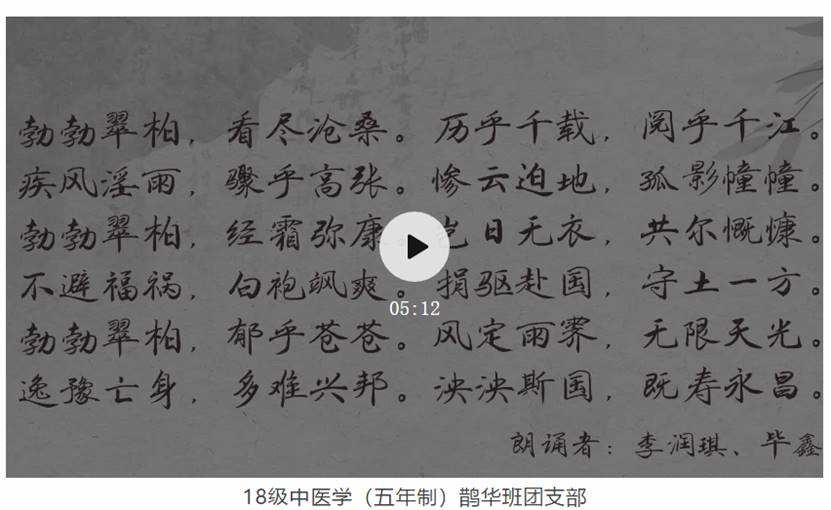 就让我们来共同欣赏一下17级中医学(五年制)03班团支部、17级中医学(五年制)鹊华班团支部、18级中医学(五年制)02班团支部的优秀作品,感受其中所传达的爱国忧民之情。