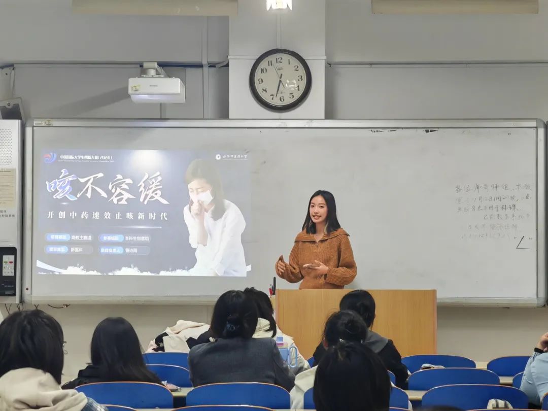 曹诗雨负责的项目“咳不容缓——开拓中药速效止咳新时代”在“建行杯”山东省大学生创新大赛(2024)获得省级银奖,在本次授课过程中,曹诗雨深入分享了她打磨项目的经历和心路历程。