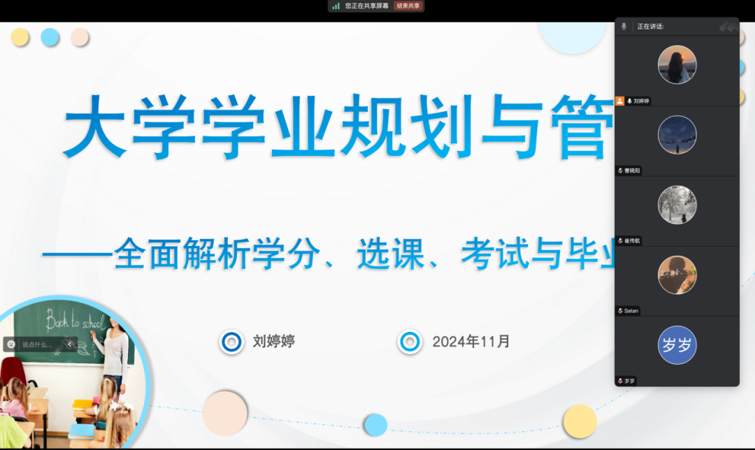 刘婷婷针对二段式教学阶段的学生特点,开展了“大学学业规划与管理”主题班会。她详细解读了学分制、选课规则、考试安排及毕业条件等相关政策,并特别强调了必修课与选修课的重要性。通过此次班会,学生们对大学学业规划有了更清晰的认识,为今后的学习生活奠定了坚实基础。