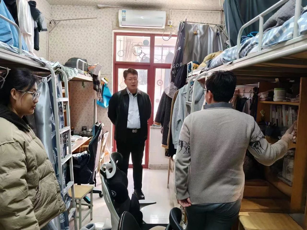 党委书记芦琳、副书记郭芳伶带领辅导员深入学生宿舍,开展防火用电安全专项检查。