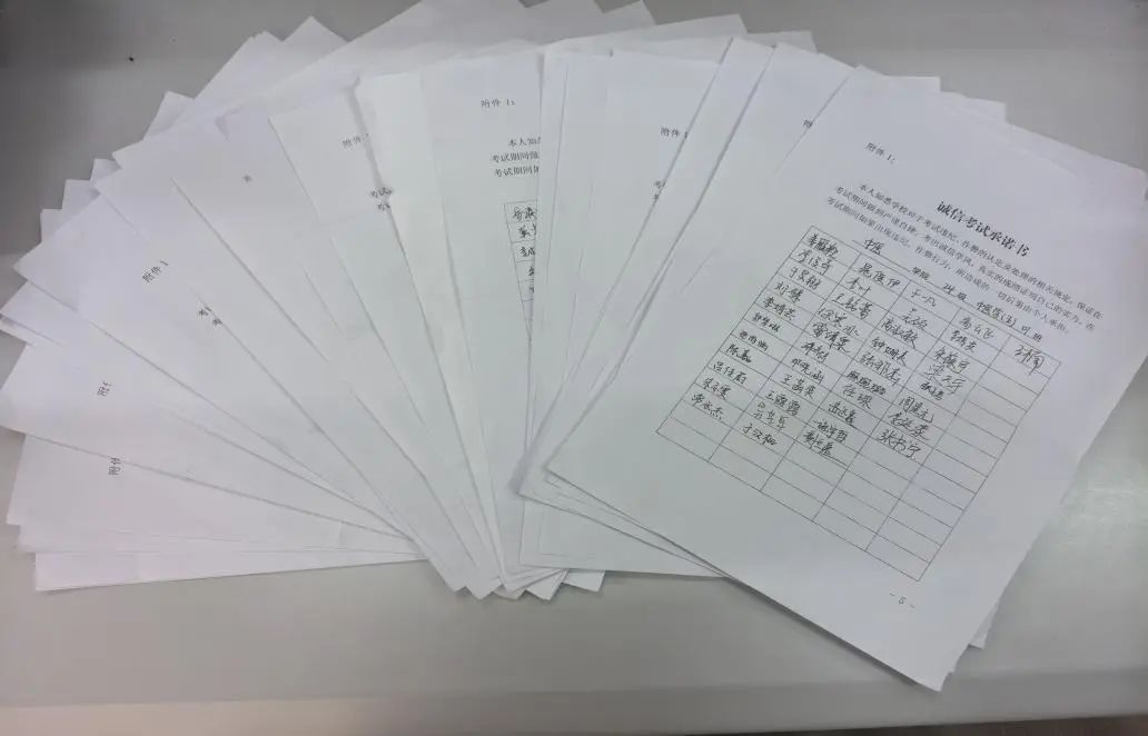 与此同时,老师们还积极分享复习经验和备考技巧,助力同学们更好地迎接期末考试。建议同学们制定科学合理的复习计划,确保时间分配得当,并强调回归教材和课堂笔记的重要性。各班级根据自身实际情况,有针对性地开展了考前辅导,有效增强了同学们的应考信心,从源头上消除了作弊的动机。班会尾声,各班统一组织同学们签署了《诚信考试承诺书》,以庄重的仪式强化同学们诚信考试的决心。
