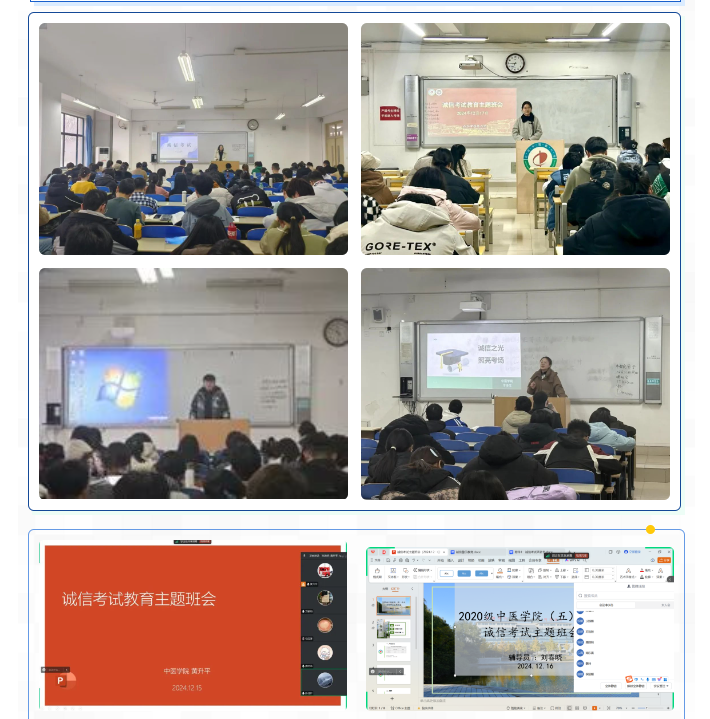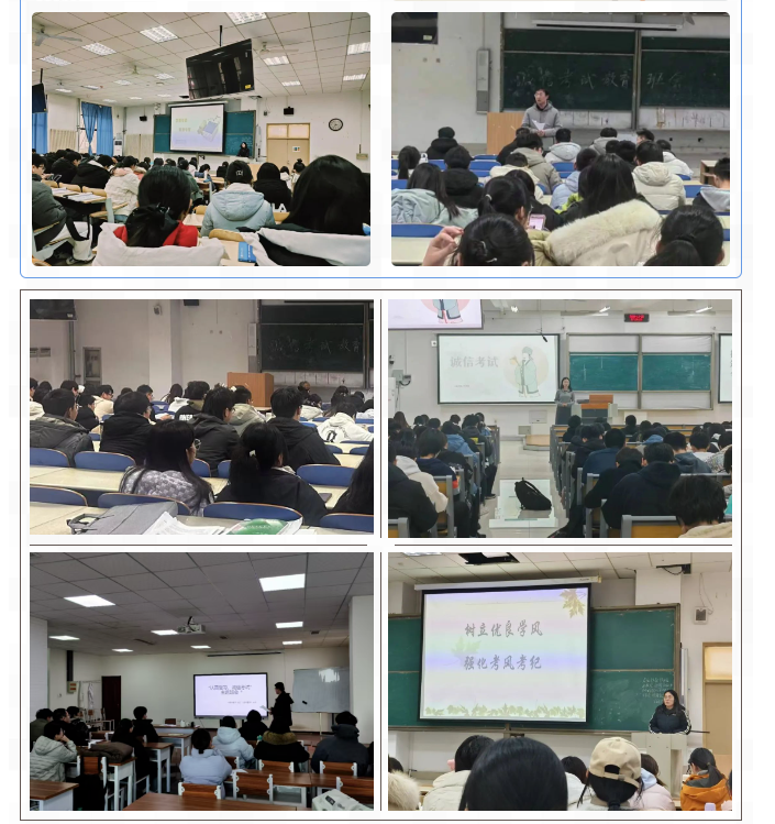 于12月16日至24日期间,各专业班级陆续组织开展以“文明考风,诚信考试”为主题的教育班会,线上线下同步进行,全方位、多渠道地将诚信考试的理念传递给每一位同学。