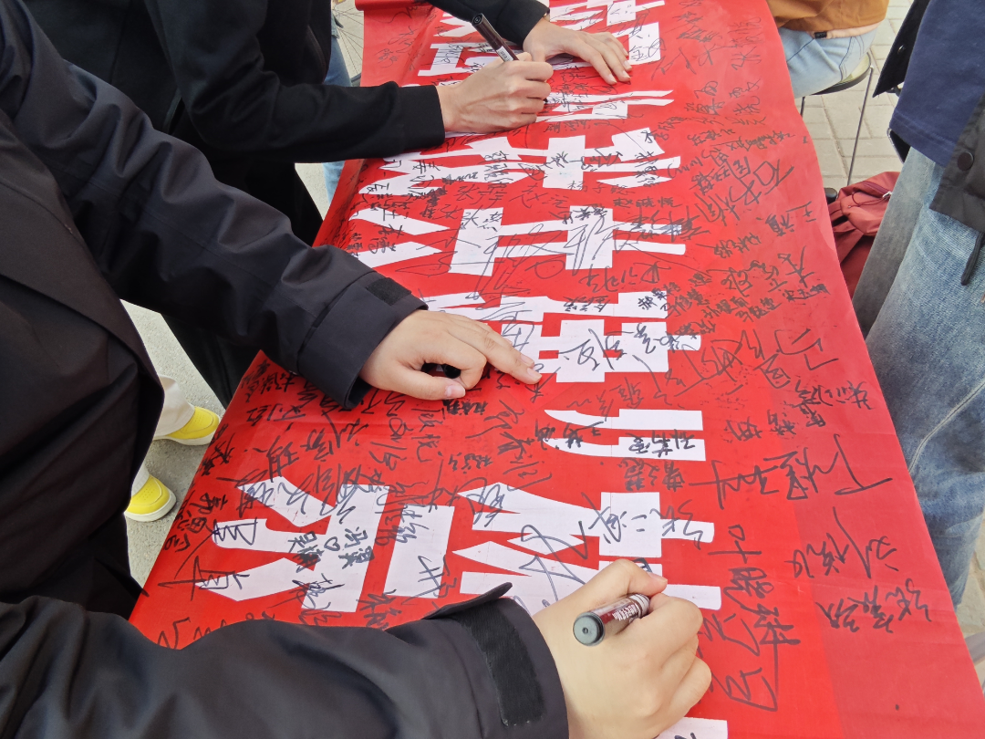 在二餐东门对面举办的禁烟宣传活动成为校园焦点。一条印有“无烟校园,你我共建”的横幅前,师生们络绎不绝,纷纷签下名字,以庄重的承诺表达对无烟环境的守护决心。现场的创意标语便利贴墙更是亮点纷呈——“青春不‘烟’,未来无‘滤’”“拒绝烟草,拥抱清新”等充满巧思的文字,既是师生对健康生活的向往,也成为校园里流动的文明警示牌,让禁烟理念通过视觉冲击深入人心。