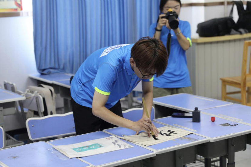 我用了两周的时间,把中国书法中的“横、竖、撇、捺”四个笔画教给了孩子们。在最后一堂课中,我问了孩子们一个问题:为什么我要从最简单的横竖撇捺教起呢?看到讲台下那一个个疑惑的眼神,我却欣慰的笑了。