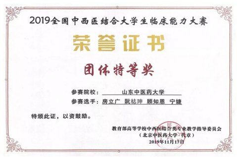2019年首届中西医结合大学生临床能力大赛中,我校2015级中西医临床医学专业房立广、宁婕和2016级中西医临床医学专业顾知恩、阮梽珅四名同学组成的代表队夺得全国总冠军,获得特等奖。其中房立广和顾知恩两位同学分别在针灸推拿和中医诊断项目中成绩位列第一,获个人单项奖。
